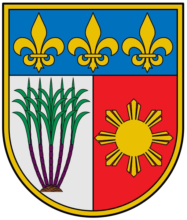 The shield is divided into two equal parts by a perpendicular line. The shield’s right is silver with a sugarcane plant (the industialization of which was introduced by Yves Leopold in Negros) with five stalks rising from its base and in natural colors. On its left is red, with the sun shining and having eight shorter and thinner rays in gold (refering to the Philippines). On the top is blue, with three fleur de lys (lily flowers, referring to Yves Leopold’s French origin).